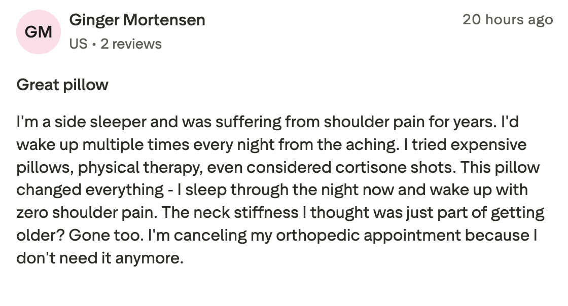 Every single pillow - including the $180 "orthopedic" one - left her neck completely